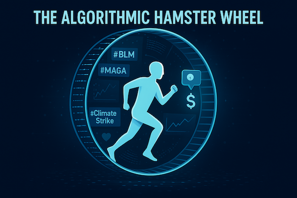 Disobedience today does not end in prison or exile. It ends in demotion—from visible to invisible, from trending to forgotten. Artificial intelligence now filters emotional tone before it observes another human eyeball. Every post, every livestream protest, every viral hashtag passes through censors deciding how much outrage is "safe for the platform." This is the new equilibrium: anger without peril. The wheel keeps on spinning. The hamsters keep on running. The noise is deafening—and the cage, invisible.